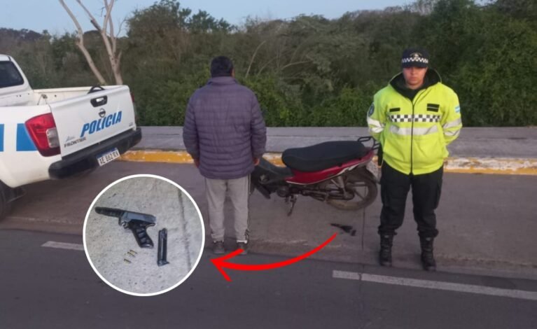 La Dirección General de la Policía Caminera comunicó que esta tarde, a las 18.45, en un control de la avenida Sabin y colectora de la Ruta N° 16 logró la detención de un hombre armando a bordo de una moto.