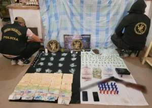 En total, se incautaron 2.062,5 gramos de marihuana, 1.294 gramos de cocaína, $1.643.900 y 12 dólares en efectivo. Tres personas fueron detenidas bajo cargos de “Supuesta Infracción a la Ley 23.737”.